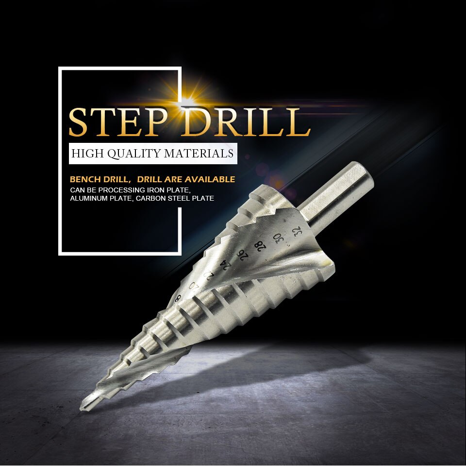 This is the new HSS Steel Big Step Cone Drill Bit Titanium Drill Bit Set, Made from high quality HSS steel and coated with titanium to reduce friction and heat It is very suitable for use for cutting holes in a variety of materials, including steel, brass, wood, plastic, etc.