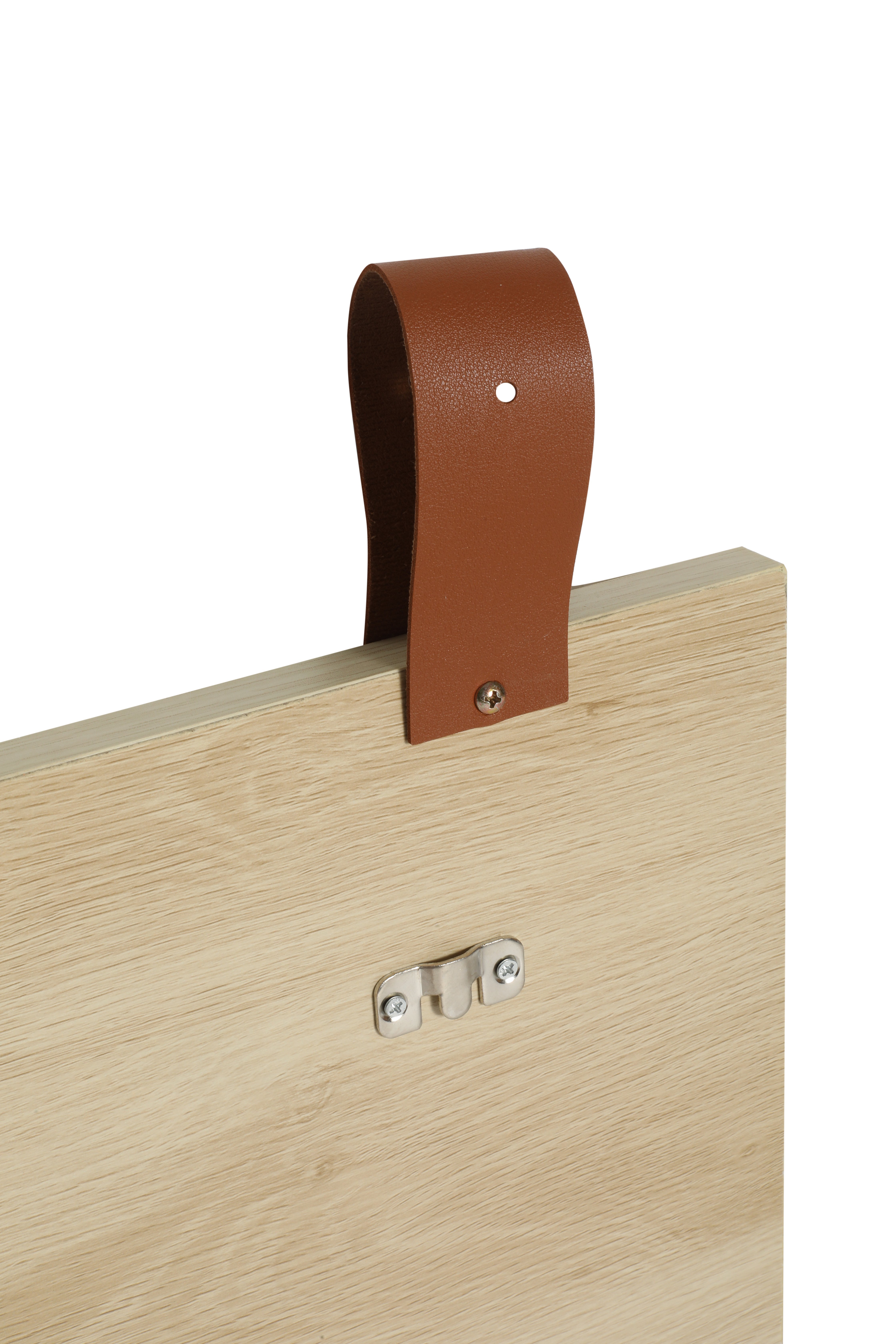 A headboard with two faux PU leather trim strips for a hanging visual effect.